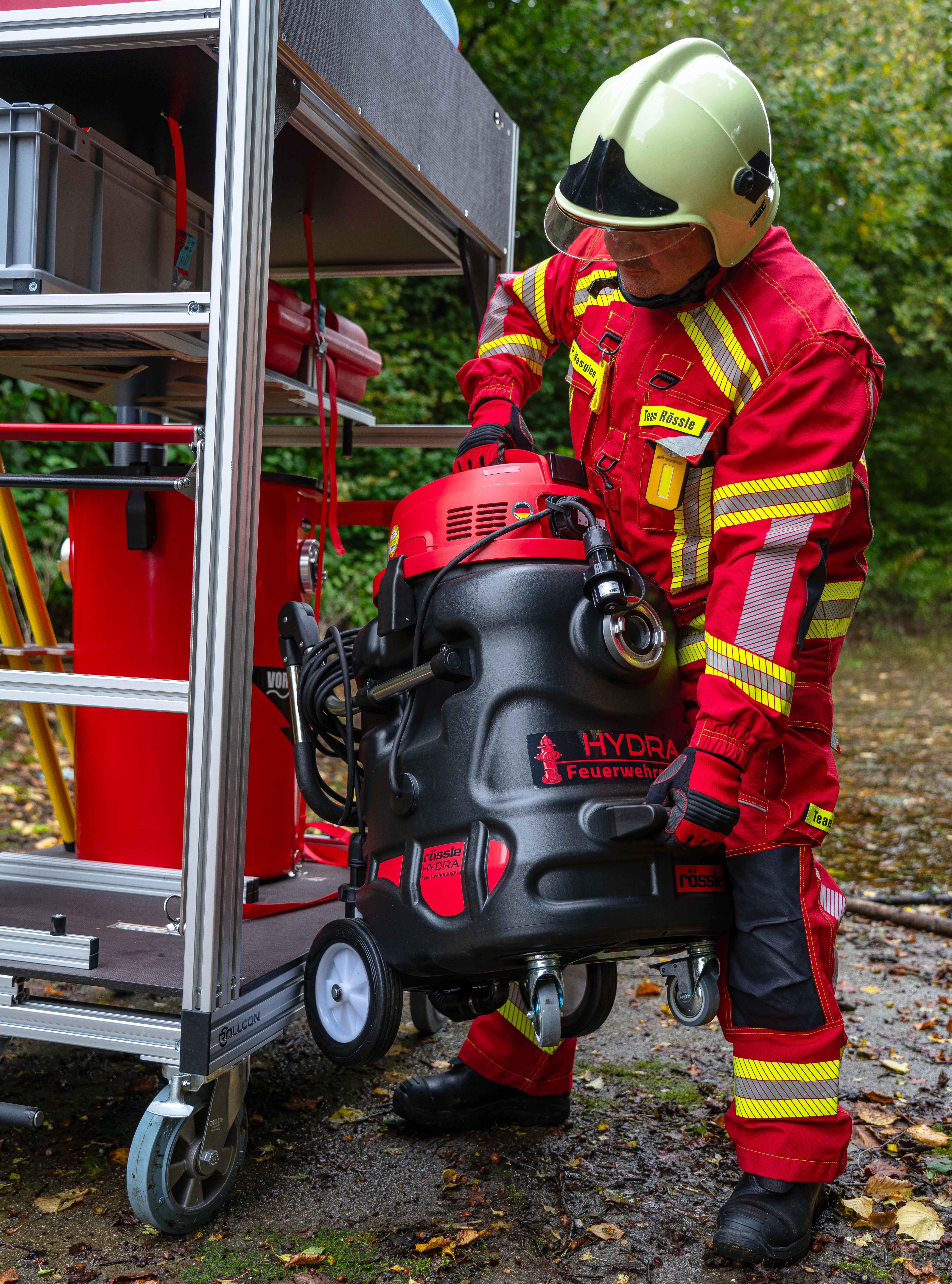 When in use, the HYDRA SWAP multi-skimmer is connected upstream of the combination of the HYDRA firefighting vacuum cleaner and the ULTRA pre-separator, in which the individual devices are connected to each other by the dimensionally stable suction hoses. The suction power is provided by the fire department vacuum cleaner. The liquids are sucked into the suction chamber of the skimmer via the suction opening at the front. At the bottom, the liquids are directed to the pre-separator via the drain hose. The oil and contaminated materials are separated in the pre-separator (more information on our ULTRA pre-separator). Water, which is also sucked in, is fed from the pre-separator to the fire department vacuum cleaner via the connecting hose. The stainless steel waste water pump located in the tank of the fire department vacuum cleaner then pumps the sucked-in liquid via the drain hose to the desired drain or disposal location. The contaminated material, which is collected in the tank of the pre-separator, can be disposed of at the appropriate collection points after use. No extra accessories are required to use the appliance combination described above. All hoses used for the connection are already included in the respective set when purchasing the Multi-Skimmer, the HYDRA fire department vacuum cleaner and the ULTRA pre-separator. Optionally, the range of the skimmer on the water surface can be increased with an optional 12 m suction hose extension.